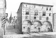 - (en) « The front facade of the Genoese Palace (1316) on Bankalar Caddesi that was demolished in 1880 »
