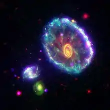 Dans cette image, la première ondulation apparait comme un anneau extérieur bleu en ultraviolet (UV). Selon les observations du GALEX, l'anneau est tellement puissant que c'est l'une des galaxies qui émet le plus d'UV dans l'univers proche. Le bleu montre la formation d'associations stellaires de cinq à vingt fois plus massives que le Soleil.