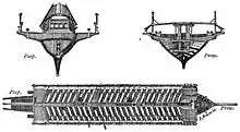 Il s'agissait de navires à un seul pont, d'environ 45 m de long et 5 m de large. Ils portaient deux rangées d'environ 25 berges avec deux rameurs à deux mâts de voile latines, appelées mestra et trinchetto . Parfois, un troisième mât pouvait être ajouté à la poupe, appelé mezzanello . Les voiles ont été nommées mezzana, terzarolo et artimònToute la vie à bord se déroule à l'extérieur, sur le pont, à l'exception de l'auvent de commandement relevé à l'arrière.
