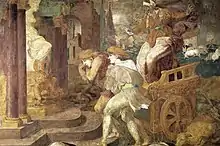 Dans la troisième travée nord est peinte la fresque de L'Incendie (par Rosso Fiorentino), dans laquelle deux personnages portent un homme et une femme âgés sur leurs épaules, traditionnellement comprise comme une représentation de l'histoire des jumeaux de Catane, qui ont fui l'incendie de leur ville chargés de leurs parents. Toutefois une restauration a montré que l'un des personnages était une jeune femme, alors que les jumeaux de Catane étaient deux hommes[5]. Il pourrait aussi s'agir d'une allusion au mythe d'Énée quittant Troie en flammes et portant son père Anchise sur les épaules ; Erwin et Dora Panofsky y voyaient également une allusion au « dévouement » des deux enfants de François Ier, otages de Charles-Quint à la place de leur père[6]. Les stucs représentent à gauche un homme barbu vêtu de braies et à droite un jeune homme portant un pagne, ces deux personnages évoquant l'amour filial, tandis que la fresque pourrait faire référence au dévouement des deux fils de François Ier, ceux-ci se livrant à l'ennemi espagnol en échange du roi alors prisonnier à Madrid.
