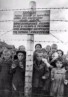 Photographie mise en scène d'enfants russes dans un ancien camp de transfert finlandais à Petrozavodsk le 29 juin 1944, un jour après que les Finlandais aient quitté la région. Le panneau indique, en finnois et en russe : « Camp de transfert. L'entrée dans le camp et les discussions à travers la clôture sont interdites, les contrevenants seront abattus."