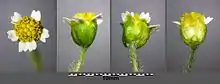 Les « fleurs » sont en fait des capitules isolés de 6 à 7 mm de diamètre[2], apparaissant au bout des tiges florales et à pédoncule et involucre velus. Les fleurons centraux tubulaires sont jaunes, nombreux, alors que les fleurons périphériques sont en général au nombre de 5 (de 4 à 8), ligulés, blancs, à ligule courte et découpée en (deux ou) trois dents arrondies. Les bractées de l’involucre sont décidues[3].