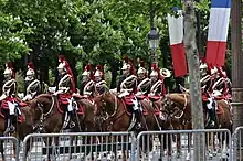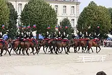 Le régiment de cavalerie comprend 480 militaires et civils, dont environ 10 % sont des femmes. Il s'agit de la plus grande « formation montée » au monde et de la dernière unité à cheval de l'Armée française[23]. Elle est jumelée depuis 1989 avec le Reggimento di carabinieri a cavallo italien et, depuis 1998, avec le Household Cavalry Mounted Regiment britannique et la Garde rouge sénégalaise.