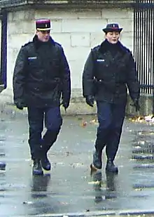 - Sécurité des palais nationaux : la mission principale est la sécurité des instances gouvernementales (Président, Premier Ministre, ministères) et parlementaires (Assemblée nationale et Sénat). Dans l'enceinte de la résidence présidentielle, les gardes républicains passent sous le commandement direct du Bureau militaire de l'Élysée. La relève de la garde des sentinelles dans les guérites autour du Palais de l'Élysée, où les gardes républicains sont en principe les seuls autorisés à porter une arme (un fusil MAS 49/56 baïonnette au canon)[17], a lieu toutes les heures[15]. Des équipes de tireurs d'élite (TEG ou tireurs d'élite Gendarmerie) participent également à la protection des hautes personnalités à l'intérieur comme à l'extérieur de ces sites.