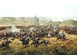 La Grande Redoute est prise quelque temps après par les cuirassiers français de Caulaincourt. Voyant la déroute de la division Kaptzevitch, les chevaliers-gardes russes se lancent dans la bataille. Après avoir stoppé les carabiniers de Defrance, ils se heurtent une nouvelle fois aux cuirassiers et gardes du corps saxons, eux-mêmes soutenus par la cavalerie polonaise qui est chargée à son tour par le régiment des gardes à cheval. Les Français ne l'emportent qu'aux alentours de 16 heures, trop tard pour gêner le repli de l'infanterie russe[6]. Sur les 450 gardes du corps saxons présents à l'appel du matin du 7 septembre, 18 officiers et 214 cavaliers ont été tués, blessés ou capturés, soit plus de 50 % de pertes[4].