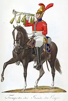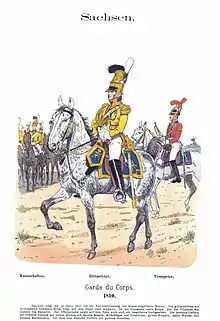 Pour les trompettes, la tenue est de même coupe quoique fortement différente par ses distinctives. D'après la planche de Liliane et Fred Funcken, la chenille et le plumet deviennent écarlates, tandis que le feuillage de chêne est remplacée par un turban en peau orné au centre d'une tête de Méduse. L'habit en drap écarlate est à collet bleu avec galons jaunes et bleus. Sur chaque épaule est placée une fine patte jaune à rayures blanches. Le cavalier est équipé, en plus de son instrument, d'une ceinture blanche à plaque dorée sur laquelle figure un aigle en argent[13]. Le trompette des gardes du corps saxons donné par Serge Letine, dans l'ouvrage L'Armée de Napoléon d'Oleg Sokolov, diffère quelque peu du précédent. En effet, la chenille est représentée noire comme pour les officiers ; le galonnage du collet est jaune-rouge et non plus seulement jaune ; enfin, la patte à rayures fait place à une contre-épaulette dorée[12].