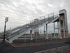L'entrée de la halte à côté de l'ancien bâtiment voyageurs, la passerelle et le parking. | ||||