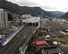 Vue d'ensemble de la gare, à gauche les voies Shinkansen, au fond à droite les voies classiques.
