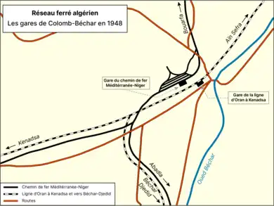En 1942, un embranchement du chemin de fer Méditerranée-Niger est créé entre la gare de Béchar - Méditerranée-Niger et la gare de Kenadsa. Une dernière section du chemin de fer transsaharien, longue de 90 km, entre Colomb-Béchar et gare d'Abadla, est mise en service en 1948[2],[1].