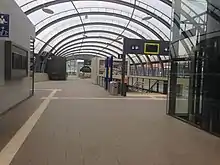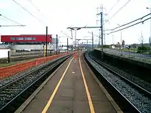 En 2005, une gare voyageurs temporaire est mise en service, la construction de la gare définitive ne débute qu'en [3]. La gare temporaire était constituée d'un quai entouré de deux voies et d'une passerelle temporaire, construite à la place d'une ancienne passerelle plus ancienne[4].