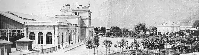 La volonté de développer le réseau ferroviaire à Grenoble émerge en 1838 lorsque le gouvernement conçoit un projet de chemin de fer qui comporte une ligne de Lyon à Grenoble, embranchement de la grande ligne de Lyon à la Méditerranée[2]. En 1845 le projet se concrétise avec une loi qui ordonne sa réalisation. Le projet tarde à se concrétiser car la première concession attribuée en 1846 à Paulin Talabot est abandonnée par l'entrepreneur, reprise par l'État en 1851, elle s'avère trop onéreuse à réaliser. Néanmoins le gouvernement impérial, convaincu de l'importance de cette ligne, conclut une concession avec le Duc de Valmy et consorts. Un décret du confirme cette concession, à 99 ans, d'un embranchement assortie notamment d'une subvention de 7 MF pour un coût estimé de 32 MF. La Compagnie du chemin de fer de Saint-Rambert à Grenoble est officialisée le . Le premier tronçon, long de 56 km, de Saint-Rambert-d'Albon à Rives est mis en service le . Le tronçon suivant doit atteindre Grenoble, mais la ville étant une place forte, c'est l'autorité militaire et l'administration supérieure qui doivent décider de l'emplacement de la gare[2]. En attente de la décision pour Grenoble, la compagnie met en service, le , le tronçon de 33 km de Rives à Pique-Pierre ou elle installe une gare provisoire en bois à proximité du viaduc en construction sur l'Isère[3]. Le la compagnie est renommée Compagnie des chemins de fer du Dauphiné[3].