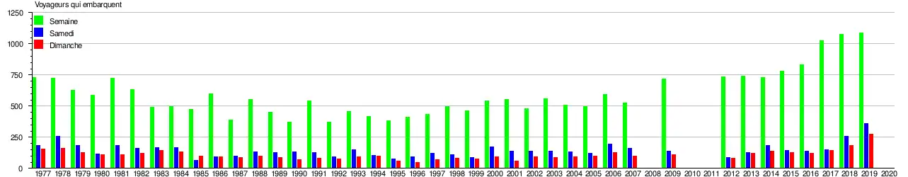 Le graphique et le tableau montrent le nombre de passagers qui en moyenne embarquent durant la semaine, le samedi et le dimanche à la gare de Linkebeek[12].