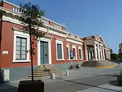 Le bâtiment de la gare est de style néoclassique d'un seul étage. Sa structure est symétrique: dans la partie centrale se trouve l'entrée principale, sur quelques marches, formée par un porche à 4 colonnes de style dorique et complétée par un fronton avec une rosace au milieu. Sur les deux côtés, il y a une porte encadrée par des volutes[3].