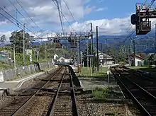 Vue aérienne de la gare avec la ligne pour Grenoble à gauche et la ligne de la Maurienne à droite.