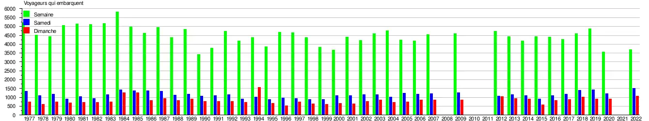Le graphique et le tableau montrent en moyenne le nombre de passagers qui embarquent durant la semaine, le samedi et le dimanche à la gare de Nivelles[10].