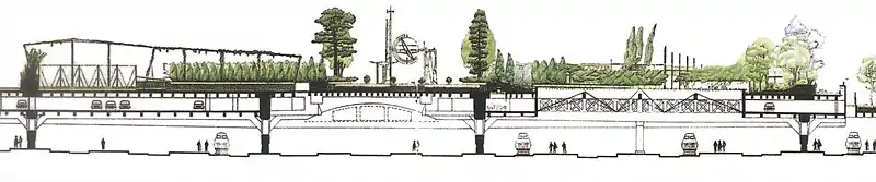 Par ailleurs, les années 1920 voient l'explosion du trafic, notamment de banlieue, depuis Saint-Lazare. Considérant les possibilités d'expansion à Saint-Lazare comme limitées, l’idée est de regrouper l'essentiel du trafic de grandes lignes dépendant de l'État[alpha 8] dans une nouvelle gare Montparnasse : le projet exposé en 1930 par Raoul Dautry, alors directeur des chemins de fer de l'État, consiste en une gare sur deux niveaux, avec 20 voies à quais de 300 m de long en surface pour les grandes lignes, et six voies à quais de 300 m souterrains et électrifiées pour la banlieue, à construire sur le site de l'actuelle gare Montparnasse[71]. Il est dès lors prévu de démolir l'ancienne gare et de la remplacer par un square avec un quadruplement des voies entre Mantes et Clamart, via la ligne de Plaisir - Grignon à Épône - Mézières, afin de rediriger le trafic de grandes lignes de la Normandie vers Montparnasse.