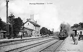 La station de Perray-Vaucluse[alpha 1], du nom de l'asile de Perray-Vaucluse, ouverte uniquement aux voyageurs, est mise en service[3] le par la compagnie du PO. Comme convenu, elle est située à proximité de l'établissement et donne sur les bois, sans aucune installation. Le , un acte de cession d'un terrain est passé devant M. Hippolyte Cocheris, maire de Sainte-Geneviève-des-Bois, délégué par arrêté du préfet de Seine-et-Oise, entre M. Paul Audibert, chef de section au service de la voie et M. Henri Maréchal, architecte des asiles, moyennant la somme de 1 510,79 francs. Cette parcelle permet la création de la place de la gare[3].