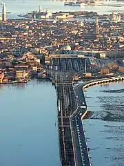 Une ligne à quatre voies relie les gares de Venise-Santa-Lucia et Venise Mestre par l'intermédiaire du viaduc des lagunes.