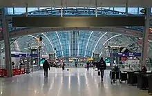 Certaines compagnies aériennes (notamment la Lufthansa) proposent d'effectuer le check-in juste à la sortie de la gare (sur le pont), d'un point de vue distance ce n'est pas vraiment nécessaire mais la plupart du temps le check-in peut s'effectuer plus rapidement à la gare. Le check-in pour les passagers de la Lufthansa est possible directement dans les gares de Stuttgart et de Cologne (les bagages sont ainsi directement acheminés à l'aéroport).