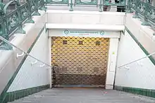 Au sud, l'accès de métro est condamné par une porte en bas de l'escalier ; une enseigne « centre de formation » rappelle la nouvelle finalité de l'endroit.