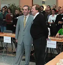En janvier 2003, Kasparov affronte Deep Junior, un programme tournant sur un micro-ordinateur multiprocesseur, dans un match de championnat du monde homme-machine sous les auspices de la FIDE, avec une bourse d'un million de dollars américains[49] ; avec une victoire de part et d'autre le match se solde finalement par un nul 3-3 (+1, −1, =4). Pour la première fois, un programme sur PC gagne une partie avec les noirs contre le champion du monde à une cadence de tournoi[50].