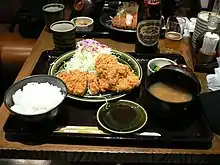La cuisine japonaise peut être définie strictement comme la cuisine traditionnelle du Japon, appelée en japonais nihon ryōri (日本料理) ou washoku (和食) précédant l'ère Meiji[1]. Elle est constituée de poissons, de riz ou de nouilles, de légumes et d'algues, généralement assaisonnés avec des condiments locaux. La viande est en général absente de la cuisine traditionnelle.