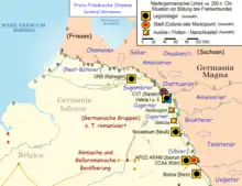 À partir de 425, l'autorité romaine est en partie restaurée dans le nord de la Gaule par le général Aetius tandis que le sud est occupé par les Wisigoths. Les Francs rhénans (Francs ripuaires), qui avaient pris pied sur la rive gauche du Rhin après 401, sont refoulés vers la rive droite en 428. Mais les Francs saliens, commandés par Clodion, s'étendent dans l'ouest de la Gaule belgique jusqu'à Tournai et Cambrai et l'empereur Valentinien III, plutôt que de les combattre, donne à leur roi le titre de légat[6].