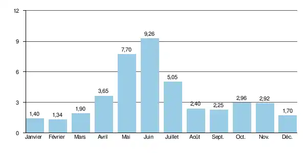 Les crues peuvent cependant s'avérer importantes. Les QJX 2 et QJX 5 valent respectivement 20 et 27 m3/s. Le QJX 10 est de 31 m3/s, le QJX 20 de 36 m3/s, tandis que le QJX 50 se monte à 41 m3/s.