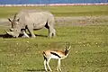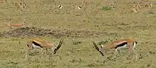 Du nord de la Tanzanie au sud du Kenya, les troupes de gazelles de Thomson résidentes ou erratiques se déplacent au gré des pluies et des pâtures, mais ne migrent jamais si vite que leurs voisins les gnous et les zèbres. Car elles n'ont pas besoin de hautes herbes pour brouter. Leur menu est plus varié, des herbes courtes, du feuillage, des fruits.