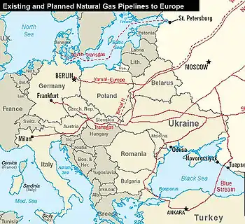 Le , à la suite d'un différend entre l'Ukraine et Gazprom sur le prix à payer en 2009 et faute de paiements d'une partie des livraisons de 2008, Gazprom a réduit, puis stoppé les livraisons du gaz naturel à l'Ukraine. En conséquence, des pays membres de l'Union européenne (UE) reçoivent moins de gaz naturel en provenance du réseau gazier de Gazprom, lequel transite en grande partie par l'Ukraine. La Russie accuse l'Ukraine de voler le gaz destiné à l'Europe pour compenser les coupures des approvisionnements qu'elle subit et tente d'augmenter le débit des gazoducs qui passent par la Biélorussie et la Turquie[22]. Le réseau ukrainien est stratégique pour l'UE, car l'approvisionnement en provenance de la Russie (fournisseur à hauteur de 40 % de l'UE) transite à 80 % par l'Ukraine[23].