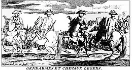 La gendarmerie est l'héritière des unités de gens d'armes, c'est-à-dire des cavaliers en armures des armées des XVe et XVIe siècles. Ces cavaliers étaient alors rassemblés dans des compagnies d'ordonnance créées le [1] et se distinguaient du reste de la cavalerie, dite par extension « cavalerie légère ». Dans les compagnies d'ordonnance étaient mêlés des gendarmes et des archers, cavaliers légers chargés de les seconder. Au fur et à mesure du XVIIe siècle, la différence pratique entre cavalerie lourde et légère disparut. Néanmoins, ils restaient distincts dans leur organisation. La première ordonnance concernant la gendarmerie de France date de 1665.