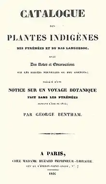 Après avoir fait paraître les notes qu'a laissées son père, il publie, en 1826 à Paris, son Catalogue des plantes indigènes des Pyrénées et du Bas Languedoc (où il donne les résultats d'une herborisation dans les Pyrénées qu'il avait entreprise quelques années plus tôt avec George Arnott Walker-Arnott (1799-1868), professeur de botanique à l'université de Glasgow). Dès ce premier ouvrage, Bentham adopte un principe auquel il ne dérogera jamais : ne jamais citer de données de seconde main.