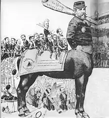 Gage du soutien des radicaux, le ministre Boulanger reste en place. Il semble dès lors cumuler les provocations envers l'Allemagne (érection de baraquements dans la région de Belfort, interdiction d'exporter des chevaux, interdiction de la représentation de Lohengrin, etc.) qui amènent l'Allemagne à convoquer plus de 70 000 réservistes au mois de février. Boulanger est d'ailleurs officiellement désigné par Bismarck comme une menace pour la paix le 11 puis le 28 janvier 1887[23]. De plus, en février, Boulanger commet une erreur politique et diplomatique en voulant donner une lettre confidentielle au tsar de Russie via l'attaché militaire mais sans passer par le ministre des Affaires étrangères, celui-ci l'en empêche. En mars, lors de la discussion d'un projet de loi militaire, il est défait sur la question de la transformation de Polytechnique en école civile. Il utilise alors les journaux pour s'adresser au président de la commission. Face au tôlé, il doit s'excuser[24].