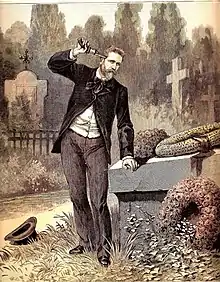 À Bruxelles, le général Boulanger vit avec sa maîtresse, Marguerite de Bonnemains, à partir du . Cette dernière, née Marguerite Brouzet, a divorcé du vicomte de Bonnemains, petit-fils du lieutenant-général Pierre Bonnemains. Ils se sont rencontrés dans un salon en 1887, et ont un véritable coup de foudre, au point que le général intente une procédure de divorce contre son épouse début 1888, mais il n'y donne pas suite[44]. Elle devient sa maîtresse et le restera pendant quatre ans, jusqu'à sa mort. Marguerite de Bonnemains est effectivement atteinte de tuberculose et meurt le 16 juillet 1891. Boulanger fait graver : « Comment ai-je pu vivre deux mois et demi sans toi » sur son monument funéraire. De fait, le général se donne la mort sur sa tombe même, au cimetière d'Ixelles, le [45]. « Il est mort comme il a vécu : en sous-lieutenant », s'exclame Clemenceau[3],[46].