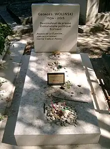 Georges Wolinski meurt le , à Paris 11e, abattu par des terroristes lors de l'attentat contre Charlie Hebdo à Paris[14]. Il est incinéré et ses cendres sont inhumées au cimetière du Montparnasse le .