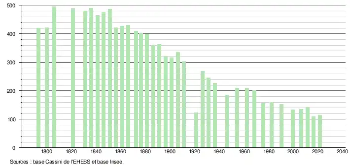 L'évolution du nombre d'habitants est connue à travers les recensements de la population effectués dans la commune depuis 1793. Pour les communes de moins de 10 000 habitants, une enquête de recensement portant sur toute la population est réalisée tous les cinq ans, les populations légales des années intermédiaires étant quant à elles estimées par interpolation ou extrapolation[15]. Pour la commune, le premier recensement exhaustif entrant dans le cadre du nouveau dispositif a été réalisé en 2006[16].