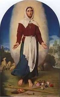 On la représente vêtue d'une longue robe recouverte d'un tablier avec un foulard sur les cheveux dans un décor pastoral avec une quenouille et un bâton de bergère accompagnée d'une brebis ou de plusieurs moutons, avec un bouquet de roses ou quelques roses à ses pieds nus.