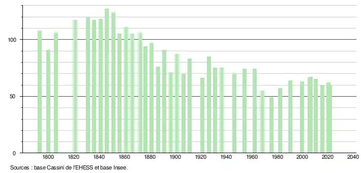 L'évolution du nombre d'habitants est connue à travers les recensements de la population effectués dans la commune depuis 1793. Pour les communes de moins de 10 000 habitants, une enquête de recensement portant sur toute la population est réalisée tous les cinq ans, les populations légales des années intermédiaires étant quant à elles estimées par interpolation ou extrapolation[19]. Pour la commune, le premier recensement exhaustif entrant dans le cadre du nouveau dispositif a été réalisé en 2005[20].