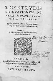 - Les Insinuations de la Divine Pieté de Ste Gertrude, Vierge, Abbesse de l'Ordre de S Benoist. Avec l'Abbregé de sa Vie. Traduction Nouvelle, [de Mège, Antoine Joseph, trans.], Paris : Chez Jean Henault, Imprimeur, Libraire-Juré, 1671.