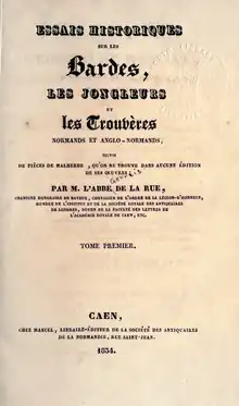 En 1815, il a publié sa communication à l’Institut dans un ouvrage destiné à donner une place importante à ses idées dans l’histoire littéraire française[2], le Mémoire sur les Bardes armoricains, prélude de son grand œuvre, paru en 1834, sous le titre d’Essais historiques sur les bardes, les jongleurs et les trouvères normands et anglo-normands, ouvrage fondamental dans l’histoire des études médiévales, auquel il a travaillé vingt ans[alpha 11]. Cet immense travail a bénéficié, outre le séjour de son auteur à Londres, du grand nombre de manuscrits médiévaux, dont la Révolution avait empli les bibliothèques, en fermant les maisons religieuses[alpha 12]. Les théories qu’il développe sur les origines et la formation de la langue française ont été confirmées par les travaux de la philologie moderne, mais comme il contredisait du tout au tout les théories « romanistes » du père de la philologie romane François Raynouard, qui postulait que les langues romanes descendaient non directement du latin, mais d’une langue post-latine commune, à laquelle il donnait le nom de « roman[alpha 13] », il en a résulté une vive polémique entre les deux savants. Bien que la théorie de Raynouard soit fausse[14], il était, comme écrivain, supérieur à La Rue qui, de plus, avait composé son ouvrage longtemps après l’époque où il en avait recueilli les matériaux. Le grand âge l’a amené à commettre[alpha 14], au cours du litige avec Raynouard[alpha 15], un grand nombre d’inexactitudes qui ont pu instiller le doute sur son érudition ou sa bonne foi[10].