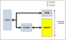L’efficacité énergétique d’un système peut être augmentée en installant des éléments mémoires pilotés par logiciel à l’intérieur des microprocesseurs (on chip memory)[83]. Cette architecture est appelée Scratch Pad Memory (SPM). Une autre mémoire « on chip » existe, appelée mémoire cache. Cependant, comparée à la mémoire cache, la SPM utilise moins d’énergie pour accéder à l’information[84],[85].