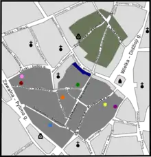 La zone désignée pour le ghetto est l'ancien quartier juif au centre de la ville. Alors que Vilnius n'a jamais eu de ghetto en soi, à l'exception de restrictions très limitées sur le mouvement et l'installation des Juifs au Moyen Âge, la zone choisie par les nazis pour leur ghetto est principalement et historiquement habitée par des Juifs. Les nazis ont divisé le secteur en deux quartiers juifs (grand ghetto et petit ghetto)[11], avec un couloir « non-ghetto » descendant la rue Deutschegasse (Niemiecka ou Vokiečių) qui les séparent.
