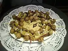 Cette présentation est marinée dans une solution de sel (saumurage), et se sert combinée avec des cornichons, des olives et un guindilla[1], parfois aussi un petit oignon, avec une conserve de poisson, généralement un anchois, unis par une pique. Actuellement, les entreprises de conserves et salaisons les distribuent généralement déjà prêtes.