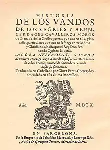• Historia de los Vandos de los Cegries, y Abencerrages, cavalleros Moros de Granada, y las civiles guerras que huvo en ella, hasta que el rey Don Fernando el quinto la gano. Traducida en castellano por Gines Perez de Hita [...] Primera parte.