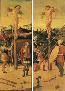 Les saints du registre central se caractérisent par une forte plastique, soulignée par la grandeur des figures, les lignes excessives des anatomies et des drapés, et l'utilisation ingénieuse de la lumière rasante d'en bas pour certains détails, comme le visage de saint Christophe. L'espace est dominé par des paysages lointains en arrière-plan ; la profondeur de la perspective est suggérée par quelques éléments de base, comme les flèches raccourcies de saint Sébastien ou le long bâton de saint Christophe[9].
