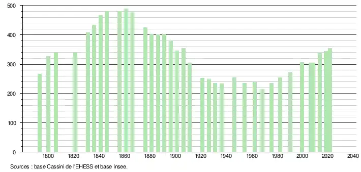 L'évolution du nombre d'habitants est connue à travers les recensements de la population effectués dans la commune depuis 1793. Pour les communes de moins de 10 000 habitants, une enquête de recensement portant sur toute la population est réalisée tous les cinq ans, les populations légales des années intermédiaires étant quant à elles estimées par interpolation ou extrapolation[18]. Pour la commune, le premier recensement exhaustif entrant dans le cadre du nouveau dispositif a été réalisé en 2008[19].