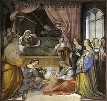- Nativité de la Vierge (1518), fresque, 295 × 317 cm, Saint Bernardin de Sienne, Annonciation d'encadrement, Oratoire de la Compagnie de Saint Bernardin, Sienne