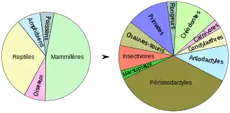 Les euthériens, animaux placentaires, sont réellement plus riches et variés. Quelques os longs de forme puissante caractéristique ont été attribués au tamandu européen[58]. Initialement considéré comme un myrmécophagidé[59], il présente, après des recherches plus approfondies la forme de base des pangolins, avec le même mode de vie[60]. Parmi les petits mammifères, on compte Heterohyus, caractérisé par deux doigts allongés et des incisives recourbées en cercle. Un squelette partiel et une mandibule attestent l'existence de Leptictidium. Cet animal prédateur se déplaçait en sautant sur ses membres arrière, ce que montre la position de base des membres de l'ordre des leptictida, et qui ne se présente plus chez les insectivores actuels[61]. Le Buxolestes, qui apparaît rarement, était au contraire un animal trapu, semi-aquatique de la famille des Pantolestidae, dont l'extérieur et la manière de vivre correspondaient à peu près à la loutre d'Europe. Très rare aussi, mais représenté par de nombreuses mandibules en partie avec toutes leurs dents, est l'insectivore Saturninia, de la famille des nyctitheriidae[58],[62]. Les rongeurs sont rares et apparaissent sous peu de formes. Ailuravus était très grand, à peu près 1 m de long, et rappelle les sciuridés actuels. Peu de restes de mâchoires proviennent de Masillamys, nettement plus petit, appelé souris de Messel d'après le site fossilifère de Messel, avec une très longue queue et une longueur totale de 40 cm. Les restes de chauves-souris sont importants, on en trouve 25 squelettes complets avec des parties des ailes. On peut surtout les ranger dans les genres Matthesia et Cecilionycteris. Ils appartiennent à la famille des Palaeochiropterygidae, dont les représentants, d'après la structure des osselets de leurs oreilles, chassaient déjà par écholocalisation dans la gamme des 30 à 70 kHz[63].