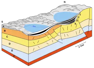 Le Geiseltal actuellement s'articule en plusieurs entités. Le seuil principal de Neumark, une élévation du grès bigarré, la partage en deux parties en gros égales, occidentale et orientale. Des bassins accessoires ou subordonnés sont le bassin d'Elise, d'Elisabeth, de Wernsdorf et autres, les seuils pré-tertiaires sont le seuil de Kayna et le seuil est[5]. Géologiquement, le Geiseltal représente une structure d'effondrement, dont l'origine n'est pas entièrement comprise, et qui a été le résultat de plusieurs processus. Il est possible que la dissolution du sel du schiste cuivreux pendant le Paléogène, reliée avec l'érosion chimique du calcaire coquillier (karst) a conduit à des pertes de masse en sous-sol, ce qui a abouti à un effondrement des couches supérieures et à la formation de bassins. En particulier, la dissolution des sels s'est conjuguée avec les forces tectoniques en sous-sol, résultant de la tectonique des plaques, qui ont aussi suscité la surrection des Alpes à la limite Crétacé-Tertiaire, il y a environ 65 millions d'années. Ceci provoque une élévation de la pression sur la couche de schiste cuivreux initialement plane, qui s'écoule alors de côté. Du côté nord du Geiseltal, on a détecté par des mesures sismiques des perturbations tectoniques, ce que l'on appelle la perturbation du bord nord du Geiseltal, qui parfois atteint une différence de niveau jusqu'à 200 mètres dans les couches supérieures (grès bigarré)[3],[4],[6].