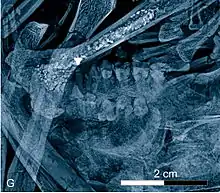 Les crocodiles sont également nombreux, avec 120 squelettes complets, plus de nombreux os et dents isolés. Allognathosuchus y représente les alligators. Il atteint 2 mètres et possède un museau très étroit. Diplocynodon fait partie des formes les plus nombreuses de crocodiles dans le Geiseltal et on le range dans la famille éteinte des Leidyosuchidae. Il vivait dans de petites étendues d'eau, tout en atteignant bien 2,5 mètres de long. Boverisuchus était à peu près aussi grand et nombreux, mais il représentait les vrais crocodiles. En raison des phalanges terminales de ses doigts élargies en sabot, on suppose que ce crocodile avait un mode de vie plutôt terrestre. Le plus grand prédateur du Geiseltal était Asiatosuchus, dont la longueur du corps atteignait 5 mètres. Écologiquement, il ressemblait au crocodile du Nil actuel et préférait les eaux ouvertes. On en a trouvé de nombreux squelettes complets. Par contre, Bergisuchus, dont l'holotype a été découvert sur le site fossilifère de Messel, n'apparaît que très rarement sous forme de quelques fragments de mandibule. C'était aussi probablement un crocodile plutôt terrestre, de petite taille avec sa longueur de 1,5 m[46]. Des recherches détaillées ont conclu que tous les crocodiles du Geiseltal occupaient des niches écologiques différentes[47]. En outre, on a trouvé des fragments d'œufs de crocodiles[48] et de nombreux gastrolithes ou pierres d'estomac, qui attestent même en l'absence de fossiles la présence des crocodiles[3].